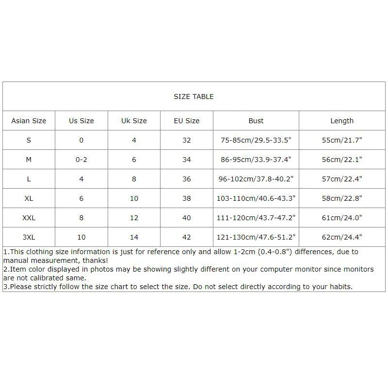 1.This clothing size information is just for reference only and allow 1-2cm (0.4-0.8") differences, due to manual measurement, thanks! 2.Item color displayed in photos may be showing slightly different on your computer monitor since monitors are not calibrated same. 3.Please strictly follow the size chart to select the size. Do not select directly according to your habits. |